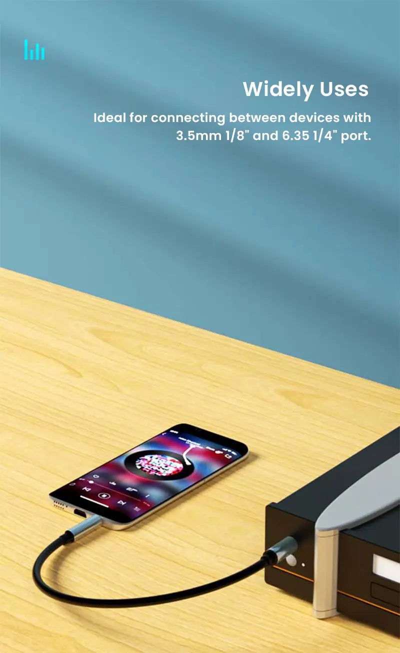 Permite conectar guitarras con salida de 6.35 mm a amplificadores o interfaces con entrada de 3.5 mm